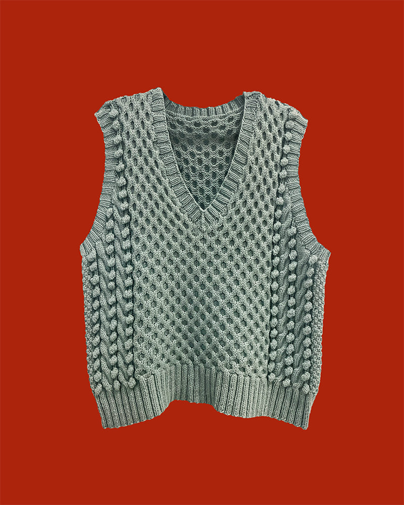 Crafted with timeless Aran stitches, the Donegal Vest is a versatile unisex piece intended to elevate your everyday style, seamlessly pairing with anything from denim to tailoring. The vest is worked from the bottom up and the front and back are worked separately.  Once complete, the front and back are seamed at the side and shoulders before working the armhole and neck edging. While intentionally oversized, the vest offers the flexibility to achieve a snug fit by opting for a size down. This pattern includes a chart as well as written instructions.